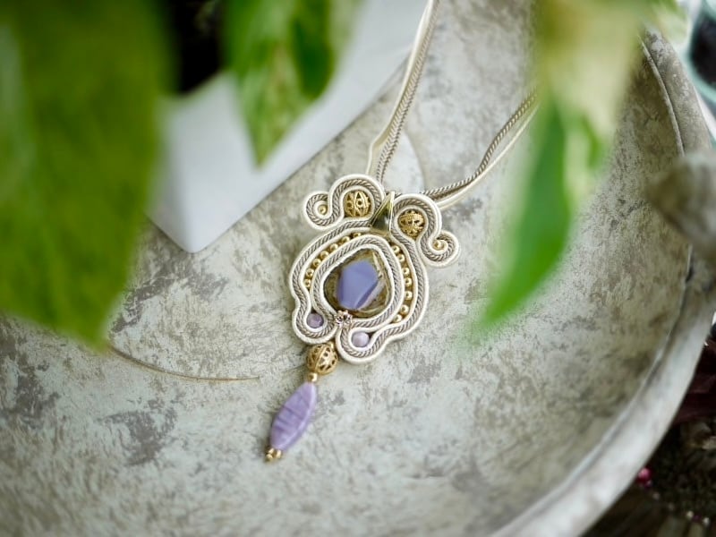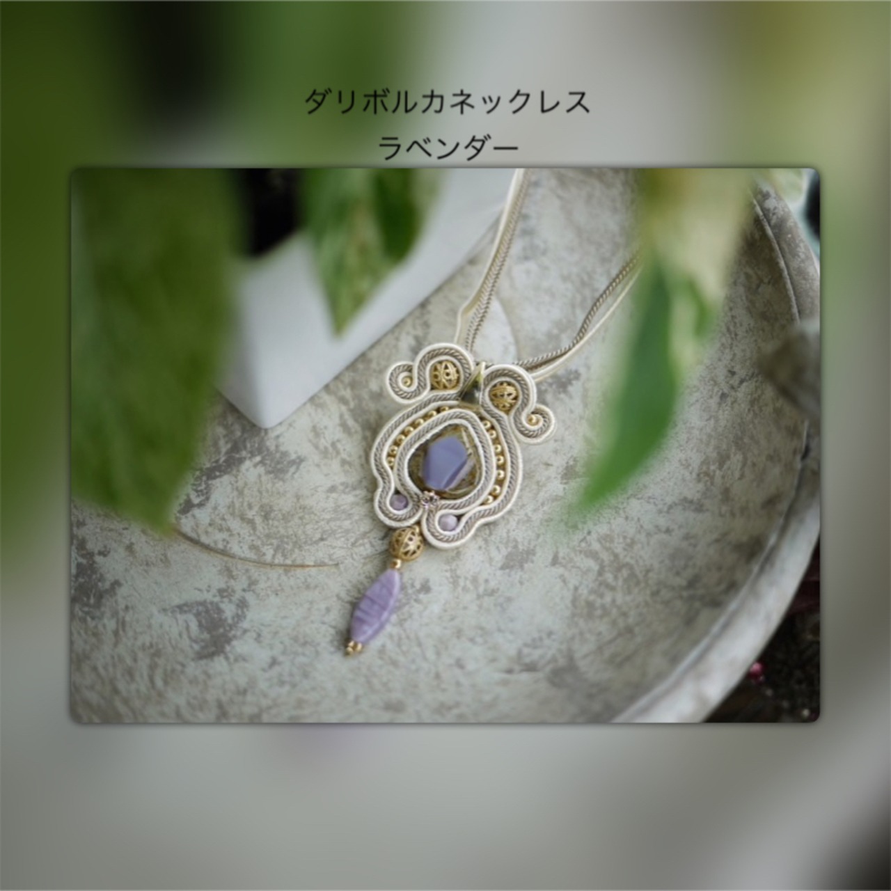 モチーフラベンダーカラーのチェコビーズとアイボリーのソウタシエコードの色合いがとても優しい印象を与えます。
