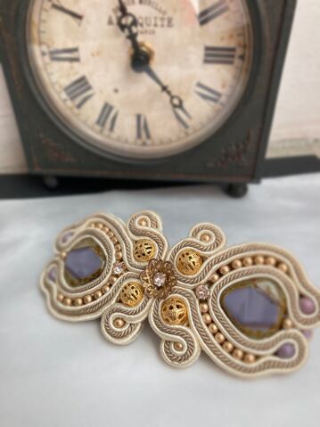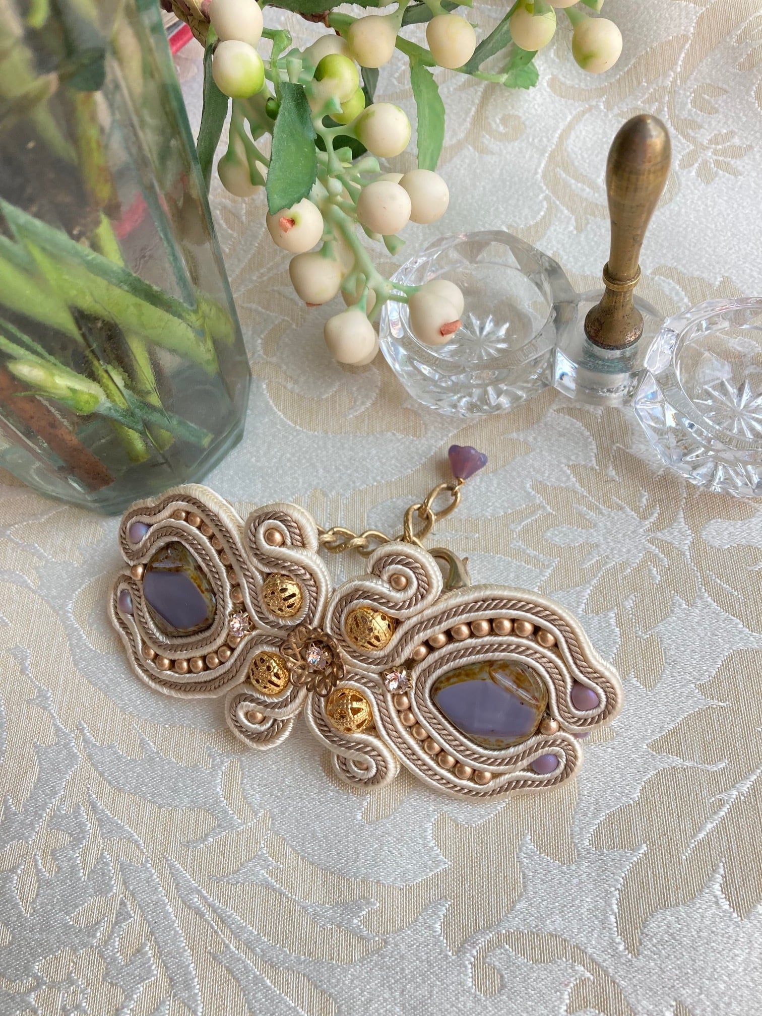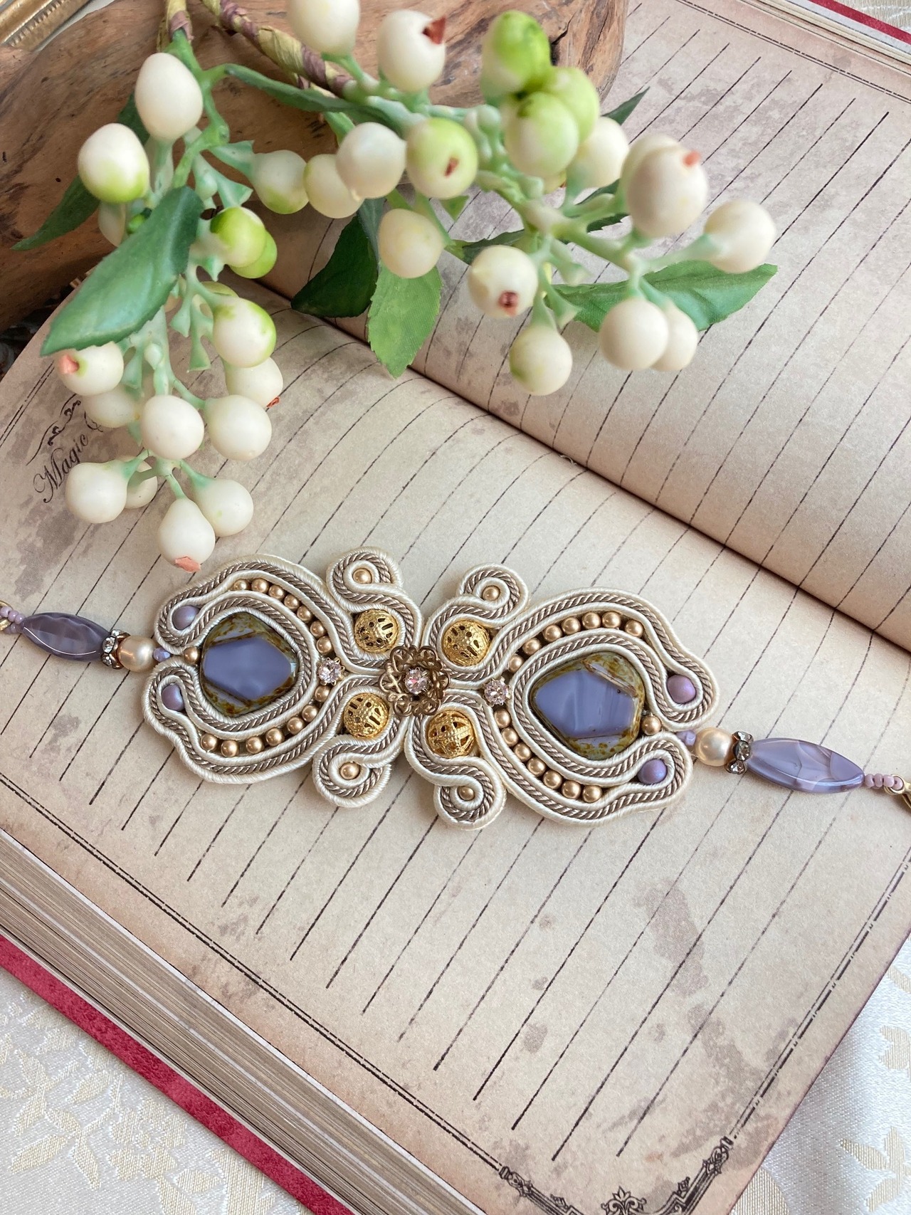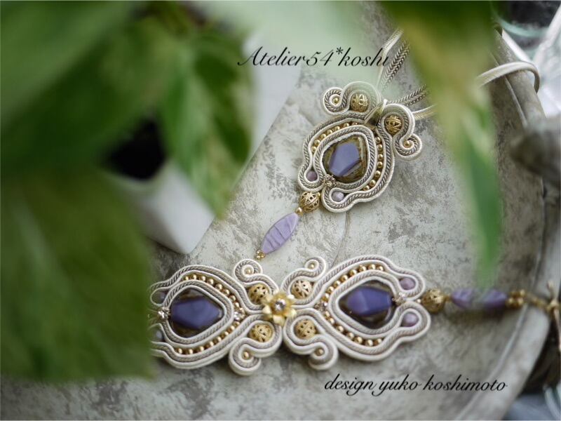 ラベンダーカラーのチェコビーズとアイボリーのソウタシエコードの色合いがとても優しい印象を与えます。