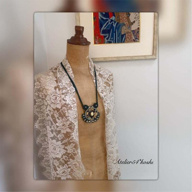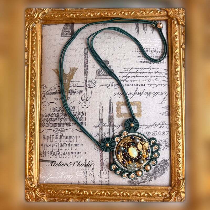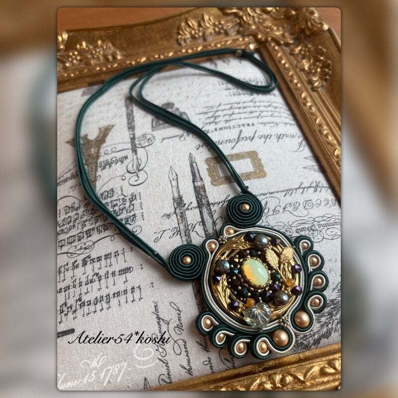メインのビーズはウランガラスのカボション。台布にメタルパーツ、アンティークビーズ、淡水パールやガラスビーズを縫い付けます。その周りをソウタシエコードでラウンドシェイプでアレンジして飾ります。曲線を意識したラウンド、渦巻きなどの形を作りアンティークスタイルな雰囲気のネックレスです。