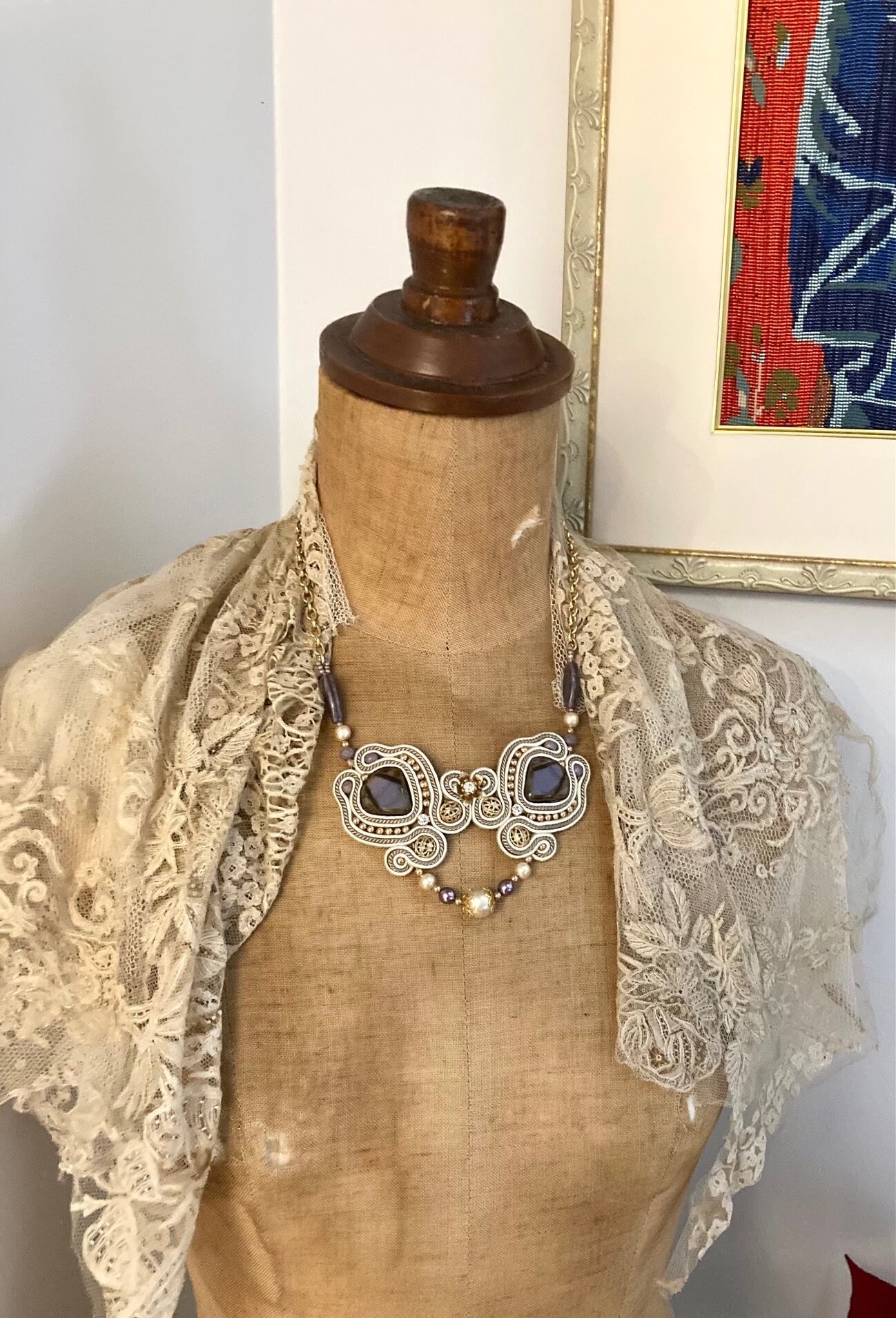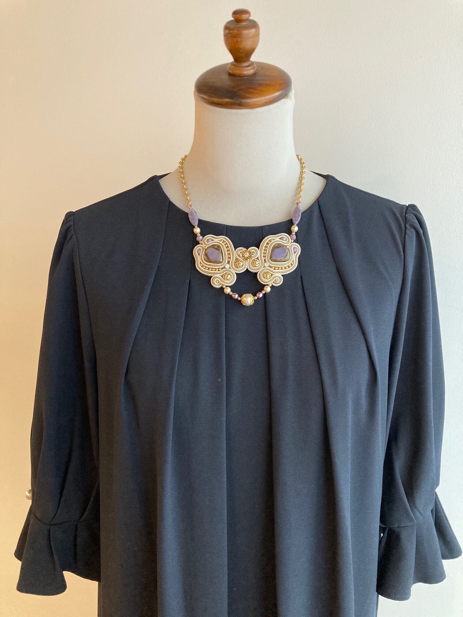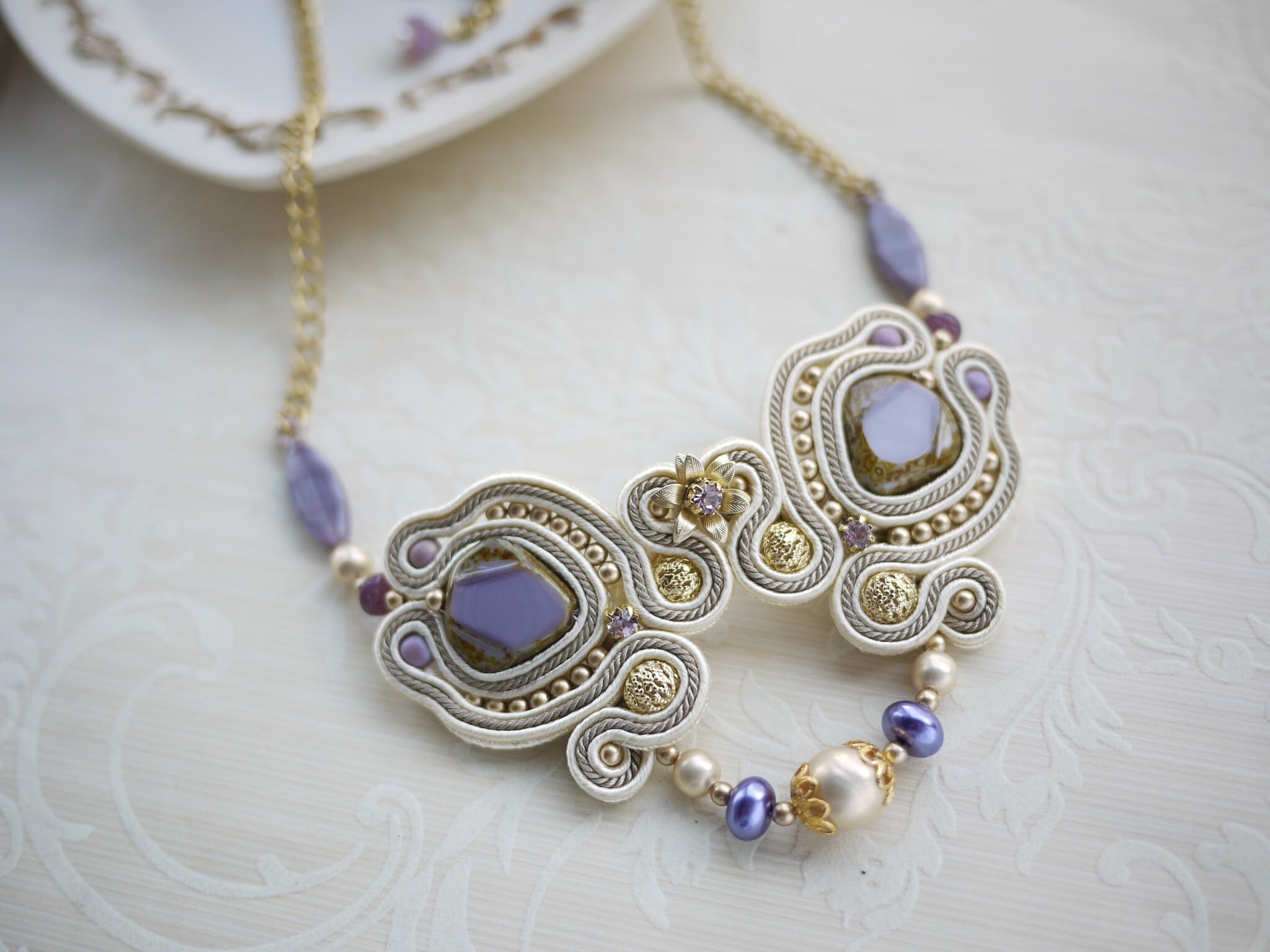 ソウタシエで作るダリボルカネックレス~elegant~が登場しました。ラベンダーカラーのチェコビーズとアイボリーのソウタシエコードの色合いがとても優しい印象を与えます。エレガントに首元を華やかに彩り、上品さを演出します。